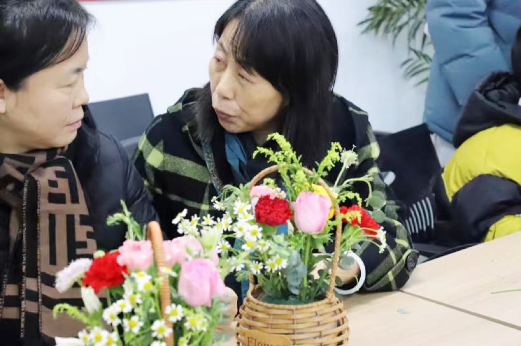 在活动开始前,志愿者精心挑选了各类鲜花,并提前浸泡花泥、分配花材、花篮、剪刀等工具,以供参与活动人员使用。活动过程中,谢瑜讲解了插花的流程及注意事项,随后每一位参与人员都纷纷发挥自己的创造力,将一朵朵美丽的鲜花插在花篮中。插花作品完成后,学生们纷纷向自己的母亲或父亲献花,表达他们的感恩之意。