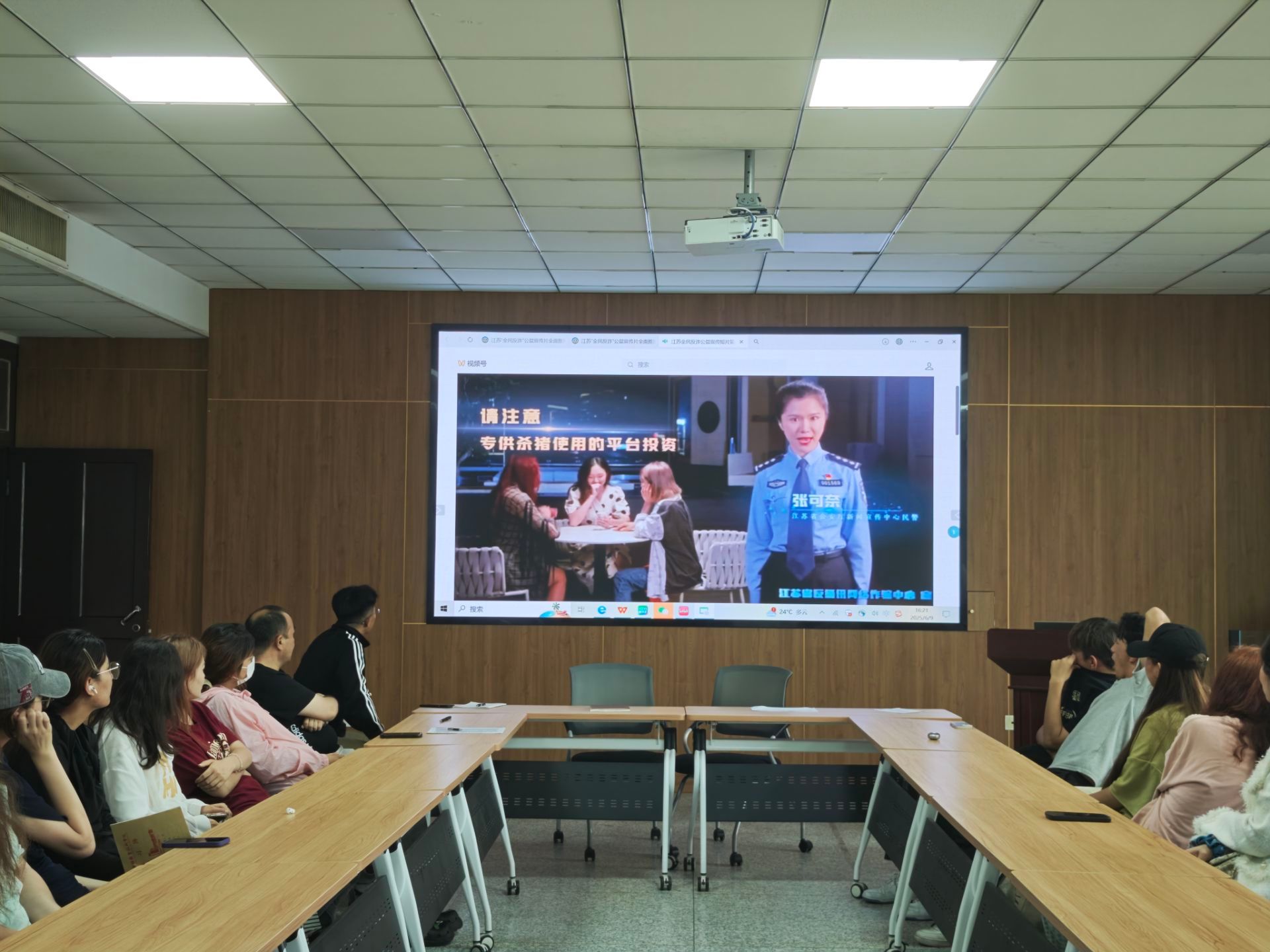 会议最后,全体与会人员共同观看了反诈防骗宣传片。宣传片详细剖析了“兼职刷单诈骗、网络贷款诈骗、冒充公检法诈骗、冒充客服诈骗、杀猪盘诈骗”等常见电信网络诈骗手法,有效提升了同学们识别和防范诈骗的能力,增强了安全防范意识。