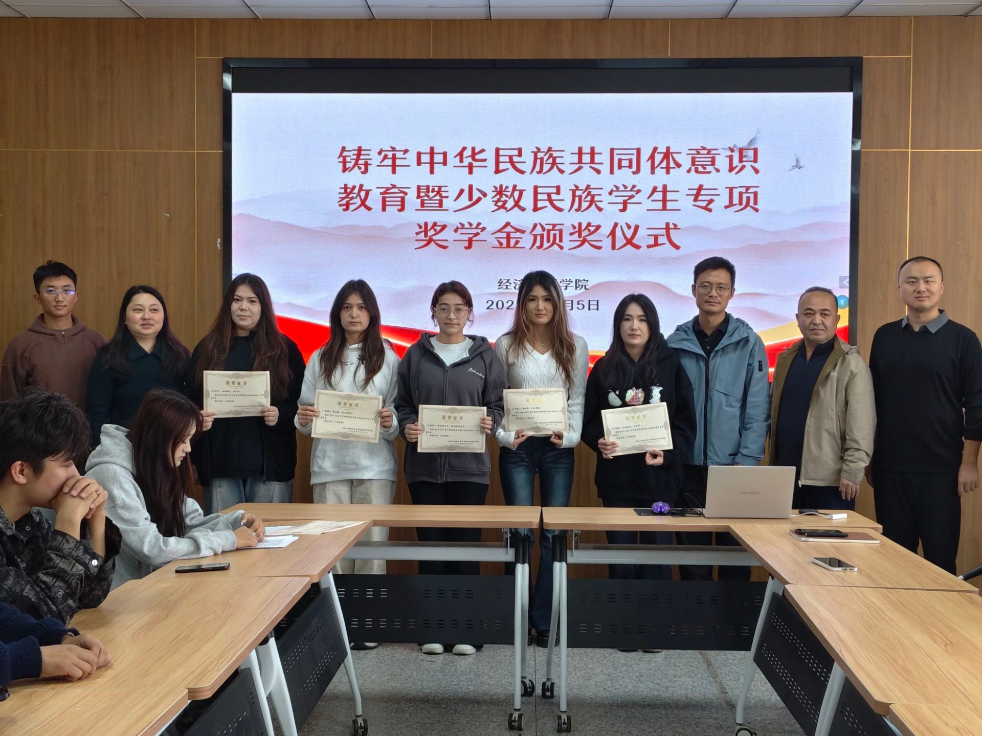11月5日下午,经济管理学院在学院会议室举办“铸牢中华民族共同体意识教育暨少数民族学生专项奖学金颁奖仪式”。学院党总支副书记范晔、王谦,新疆教师艾比不拉·塞买提、新疆派驻教师曾帆捷,以及西藏教师江村巴登应邀出席。活动由辅导员李楠主持,2025级40余名少数民族学生、家庭经济困难学生代表共同参与。