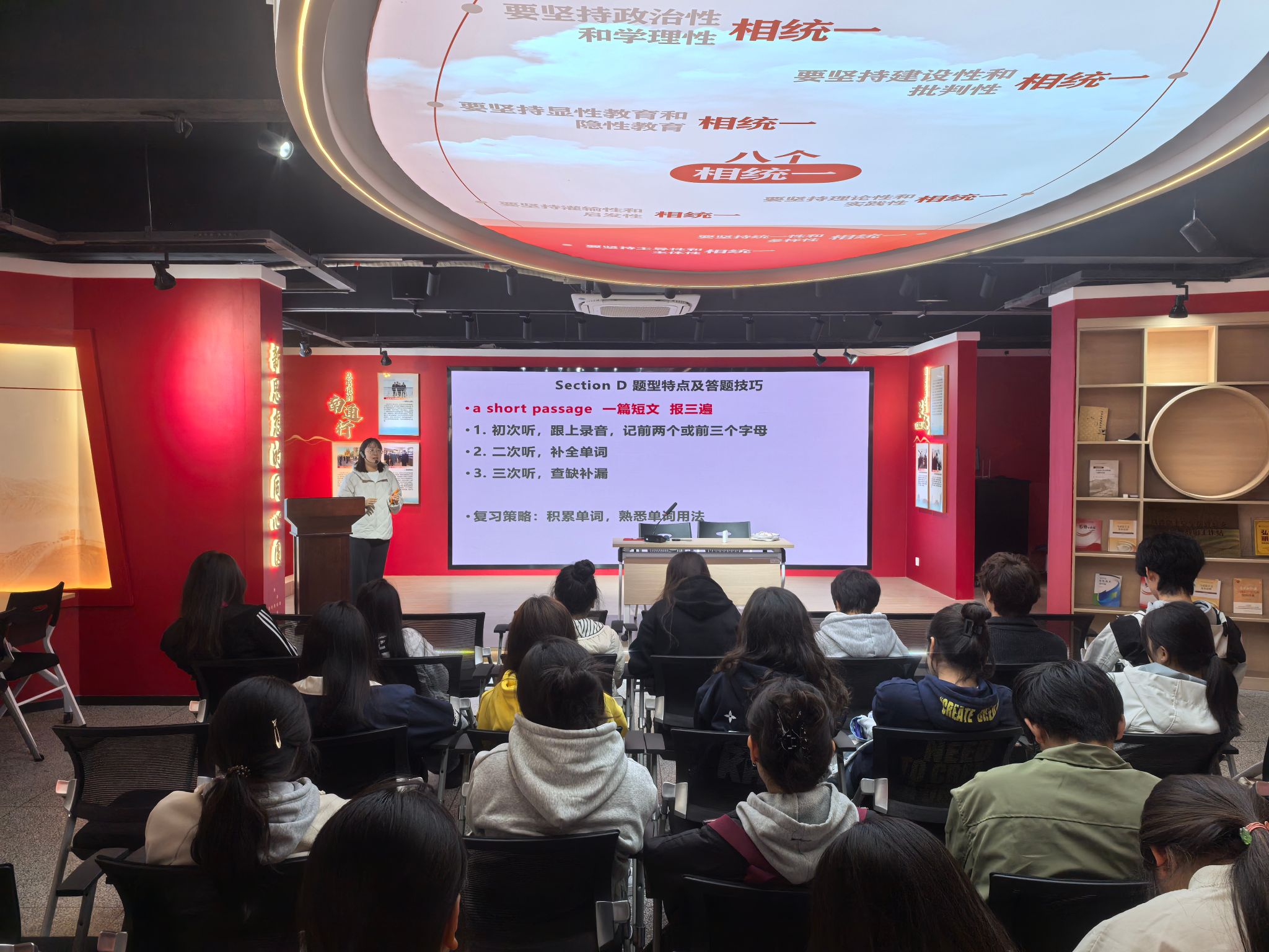 活动结束后,同学们意犹未尽,许多学生回到宿舍和班级后,主动与室友、同学分享交流思政课的所学所悟,并积极传递英语考试的备考策略与学习资料。这种自发性的分享,将单一活动的受益面有效扩大,使思想引领与学业帮扶的链条从活动现场延伸至社区生活空间,真正拓展了一站式社区学习的平台和范围,营造了“互帮互学、共同进步”的浓厚社区氛围。