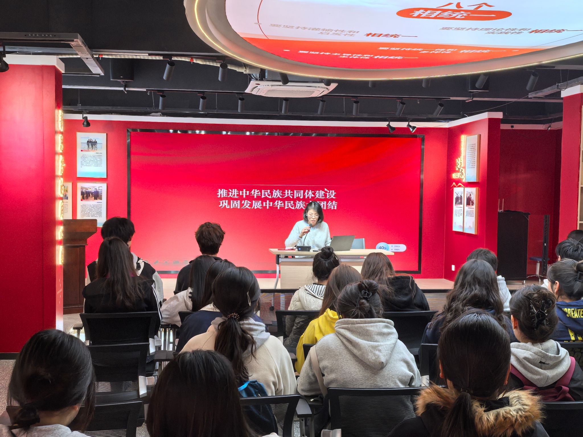 同学们走进学校新思想践悟馆进行参观学习,并参加了专题思政课与英语备考辅导,在沉浸式、多元化的学习体验中深化了思想认识,提升了综合素养。践悟馆内,丰富的图文史料以生动的方式展现了习近平总书记的重要思想,以及他在从政生涯中始终秉持的为民情怀。随后,学校马克思主义学院徐甜甜老师以“推进中华民族共同体建设,巩固发展中华民族大团结”为主题,为同学们带来一堂生动而深刻的思政课。徐老师用亲切的语言和鲜活的案例,深入浅出地阐述了铸牢中华民族共同体意识的重大意义,有效激发了同学们的民族自豪感与团结奋进的决心。