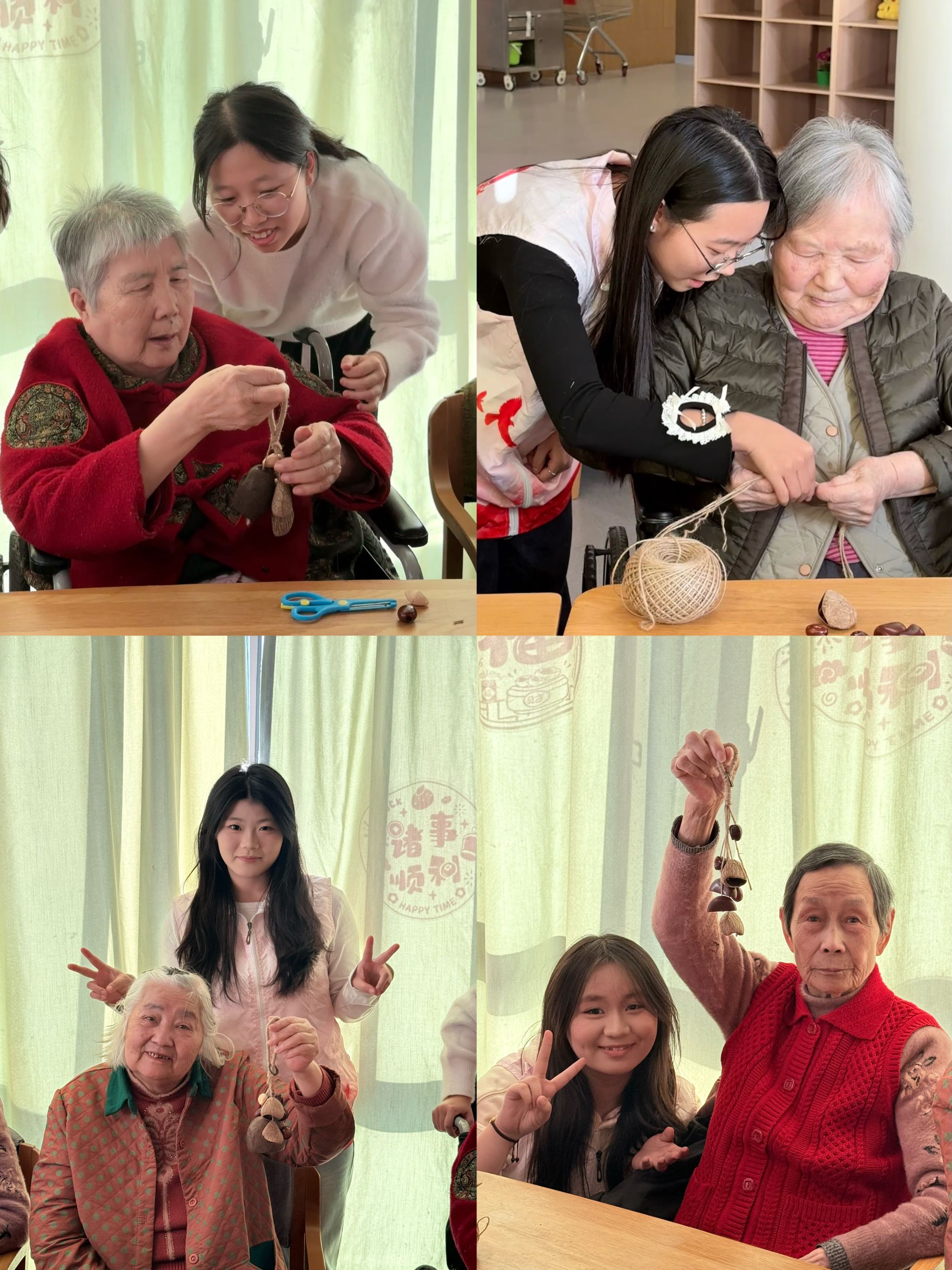 随后的风铃制作环节将活动推向高潮。同学们与长者“一对一”结对,共同将果壳、铃铛等自然材料,巧妙串联成独具个性的植物风铃。学生们俯身协助制作,侧耳倾听故事,清澈的铃音与现场的欢声笑语交织,暖意融融。一位长者手持作品开心地表示:“和孩子们一起做手工,感觉自己又年轻了,这铃声真好听!”