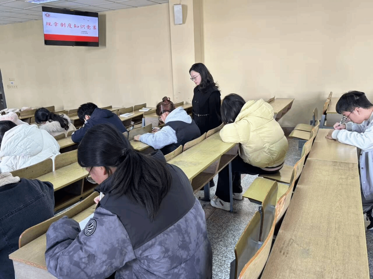 在监考工作人员强调考试纪律,规范学生考试行为后,考试正式开始。此次考试采取闭卷形式,试题围绕我校《学生手册》中的相关规章制度,本次考试内容涵盖学生奖惩制度、资助管理制度、宿舍管理制度、共青团制度等多个方面,意在全面考察同学们对校规校纪的认知程度,帮助其快速了解与掌握学校规章制度。考试期间,同学们上交手机认真答题,自觉遵守考场纪律。监考人员恪尽职守,严格执行考试实施程序,维护考场纪律,如实记录考试情况,保证考试的正常进行。