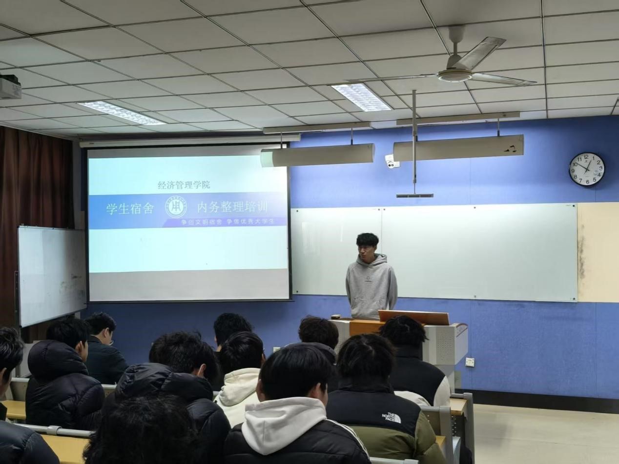 为切实改善宿舍内务状况,解决部分宿舍卫生差、管理不规范等问题,2025年12月26日中午,经管学院在致知楼106开展了宿舍内务专项培训,经济管理学院党总支副书记沈峻锋、辅导员班主任代表及内务得差宿舍成员出席本次活动,针对宿舍内务现存问题、整改方法及集体荣誉感培养等内容展开培训。