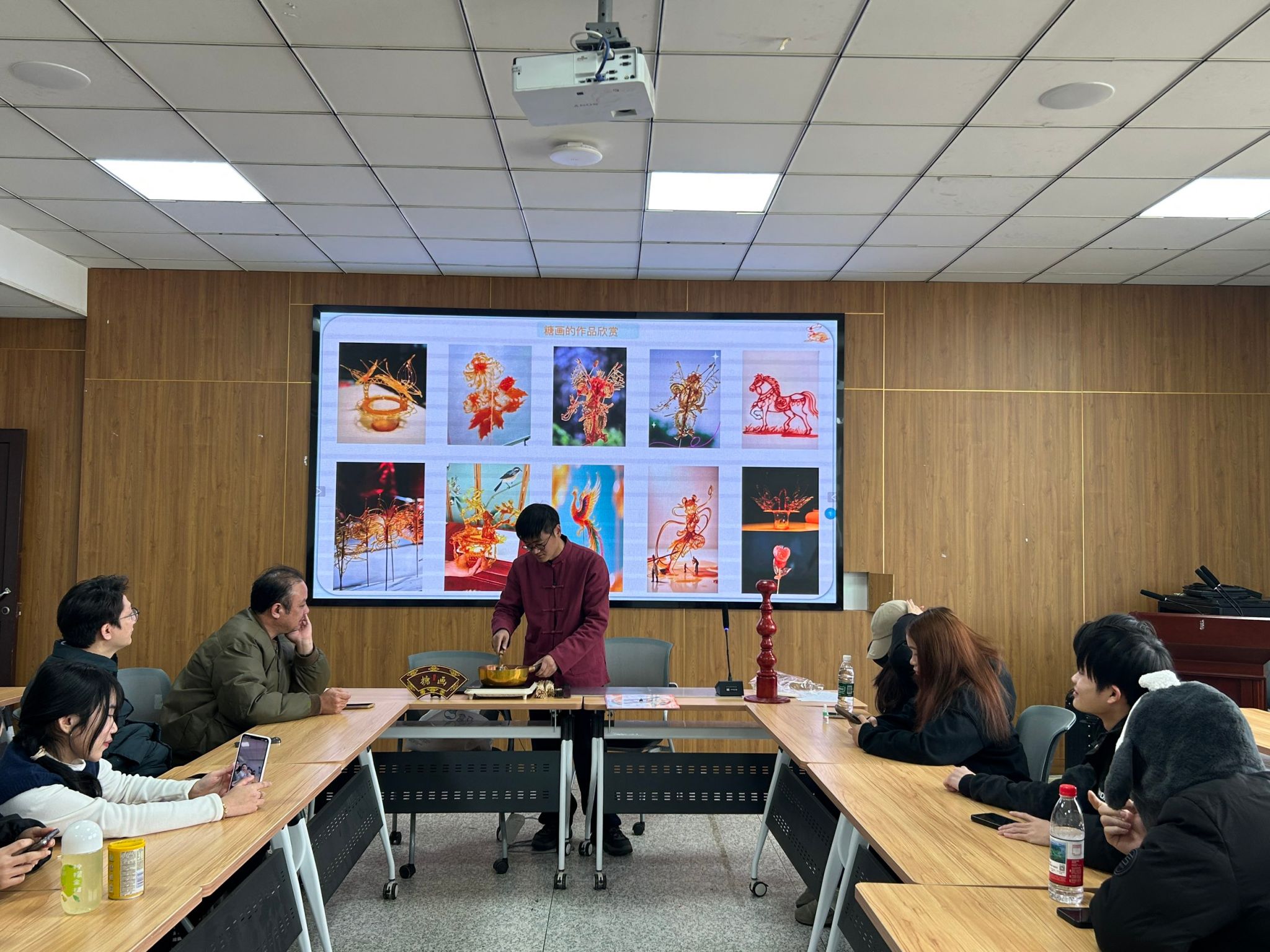 2月3日立春前夕,经济管理学院在致知楼604教室举办“糖丝连中老,画韵迎立春”非遗糖画文化宣讲与体验活动。活动特别邀请南通市级非物质文化遗产糖画项目传承人施剑锋老师主讲,学院党总支书记钱晋、党总支副书记沈峻锋、留学生班主任与全体留校老挝学生共同参与。