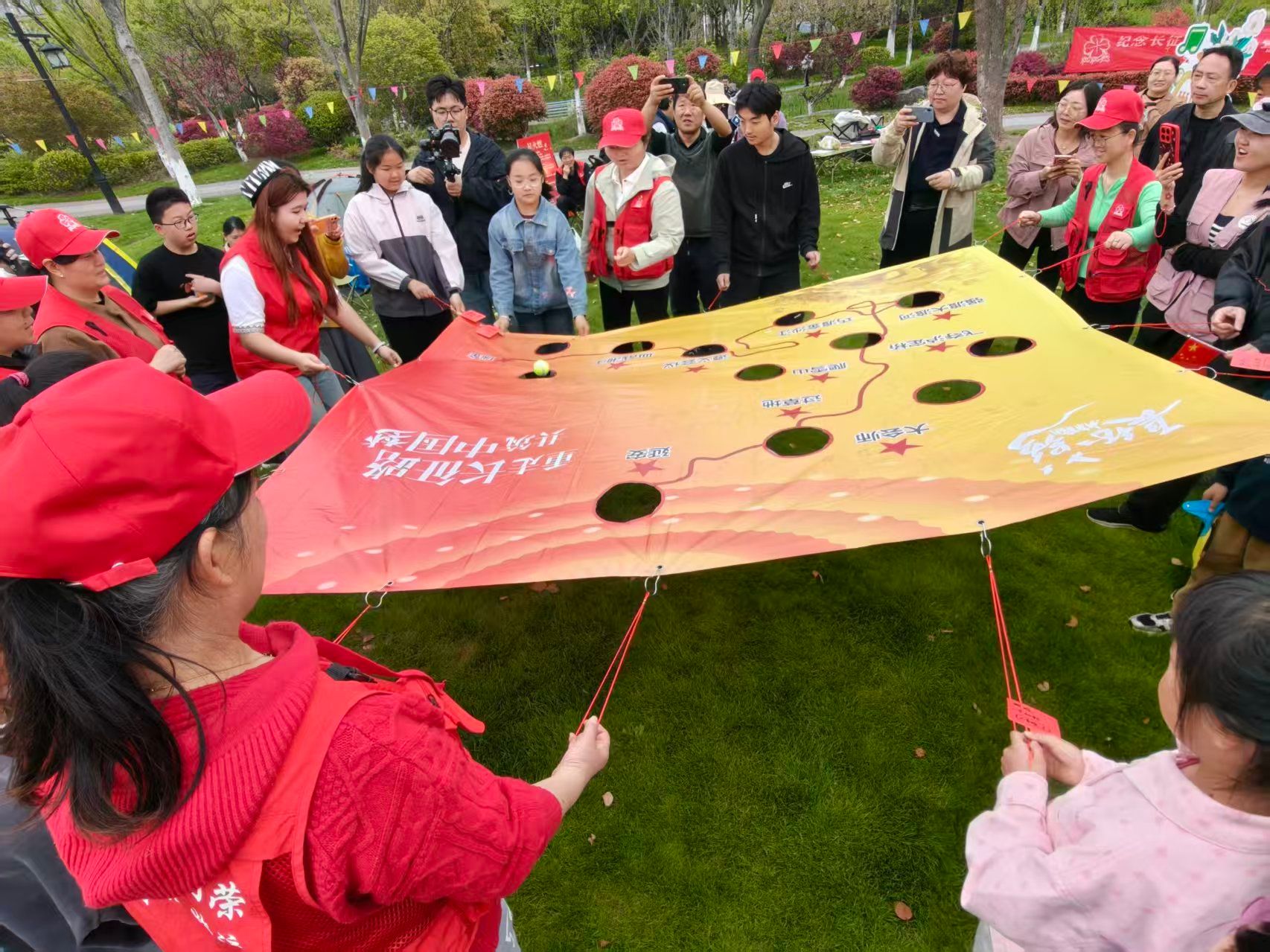 活动现场,缤纷帐篷点缀春日草坪,红色主题氛围浓厚。志愿者们提前抵达,有序完成场地布置、物资准备、人员引导等工作,以饱满热情与细致服务保障活动顺利开展。伴随着激昂旋律,《花开中国》《星火燃》等红歌依次唱响,我院学子与现场亲子家庭、退休劳模齐声合唱,用嘹亮歌声抒发爱国情怀。在经典诵读环节,志愿者们带头参与长征故事接龙、《毛主席诗词》朗诵,与全体人员共同诵读《七律・长征》,在铿锵有力的字句中,重温长征路上的艰难险阻与革命先辈的坚定信念。