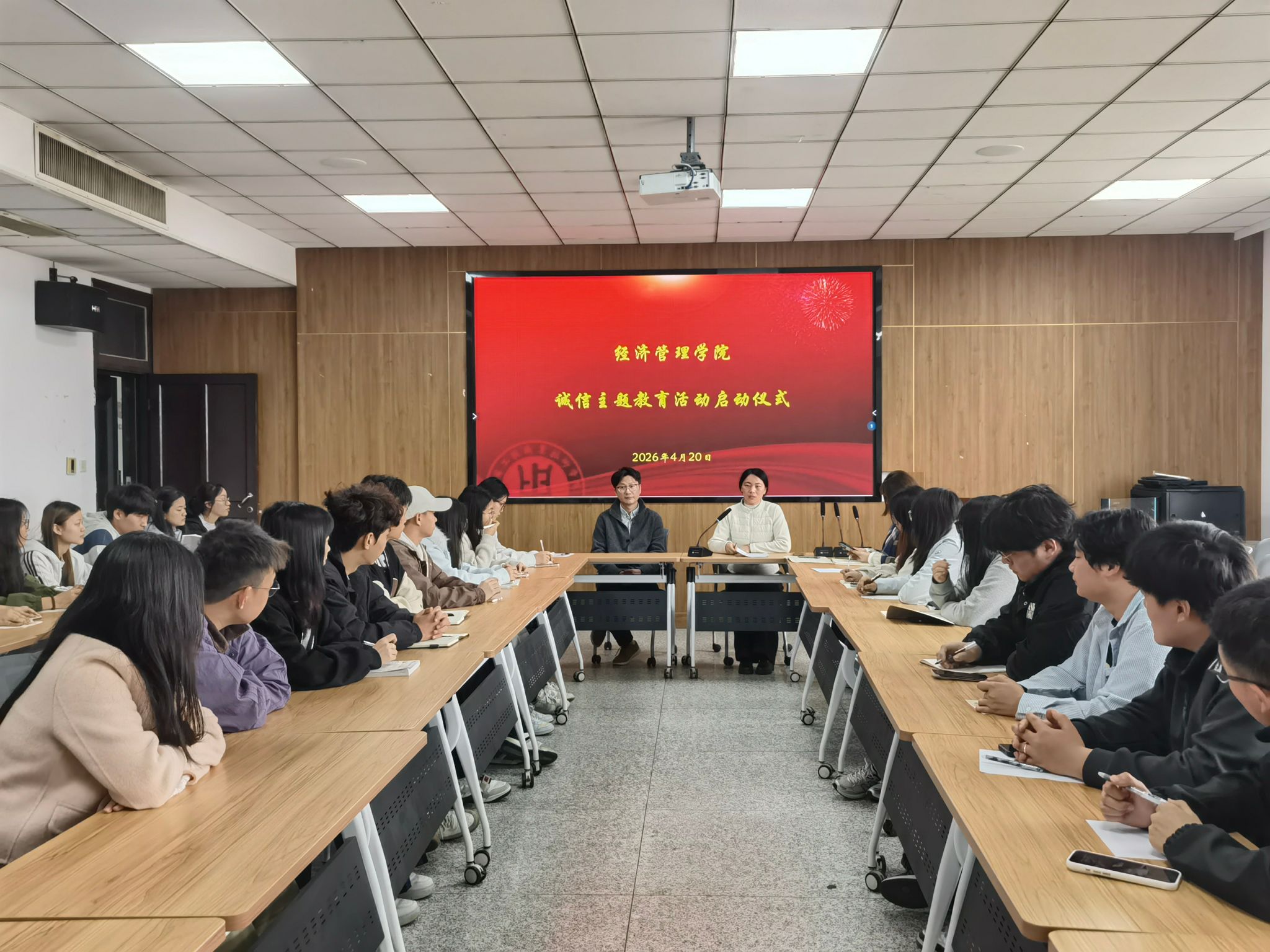 4月20日,经济管理学院在致知楼604会议室举办2026年诚信主题教育活动启动仪式。学院党总支副书记沈峻锋、学工办主任朱建兰、辅导员陶艺和邢雅楠出席会议,学院全体24、25级班长参会,会议由朱建兰主持。