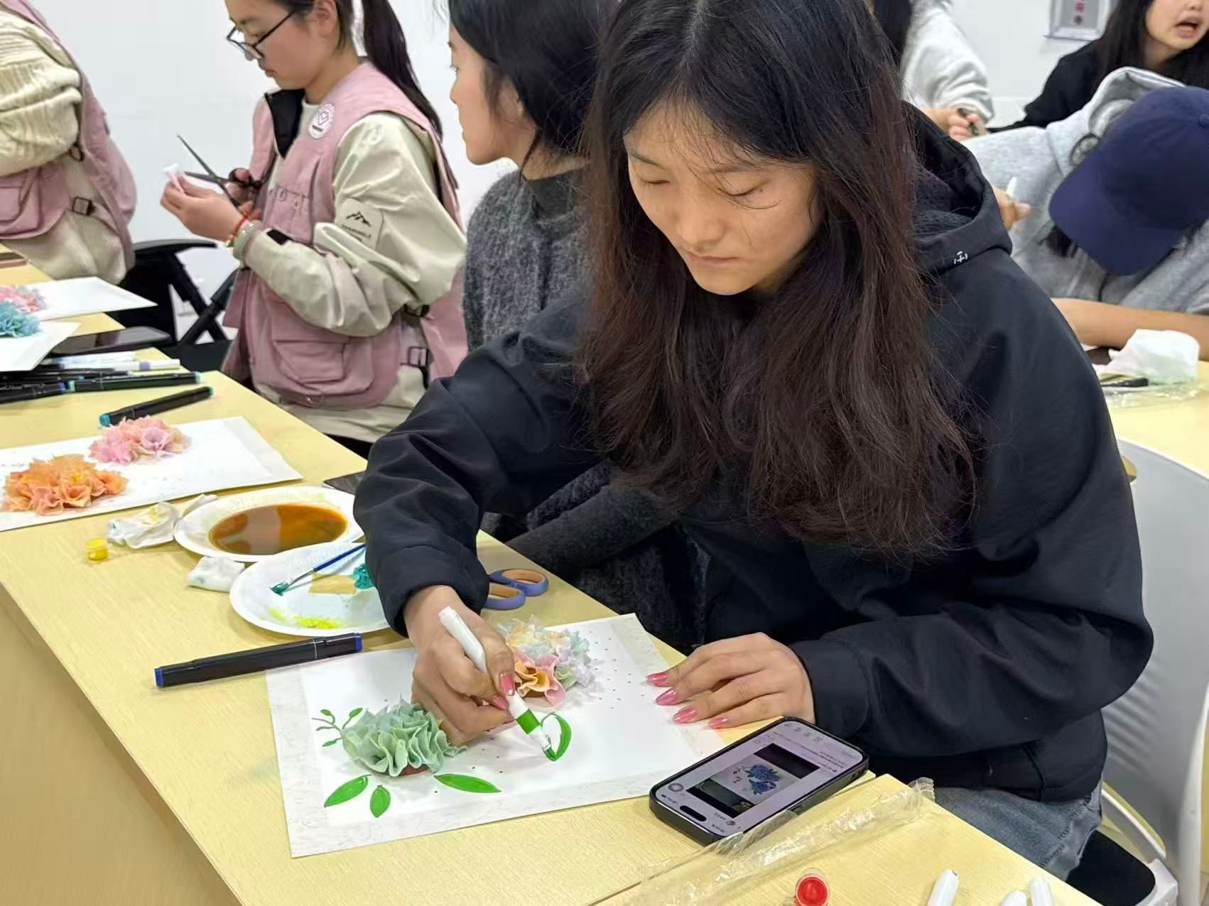 活动设置“emoji 猜书名”趣味环节与扎染绣球花创意手工环节。趣味游戏以轻松活泼的形式检验阅读积累,调动现场参与热情;手工创作将阅读温情与动手乐趣相融,同学们在细致创作中感受美学与耐心,进一步丰富了活动体验。活动最后,全体人员合影留念,定格美好瞬间。