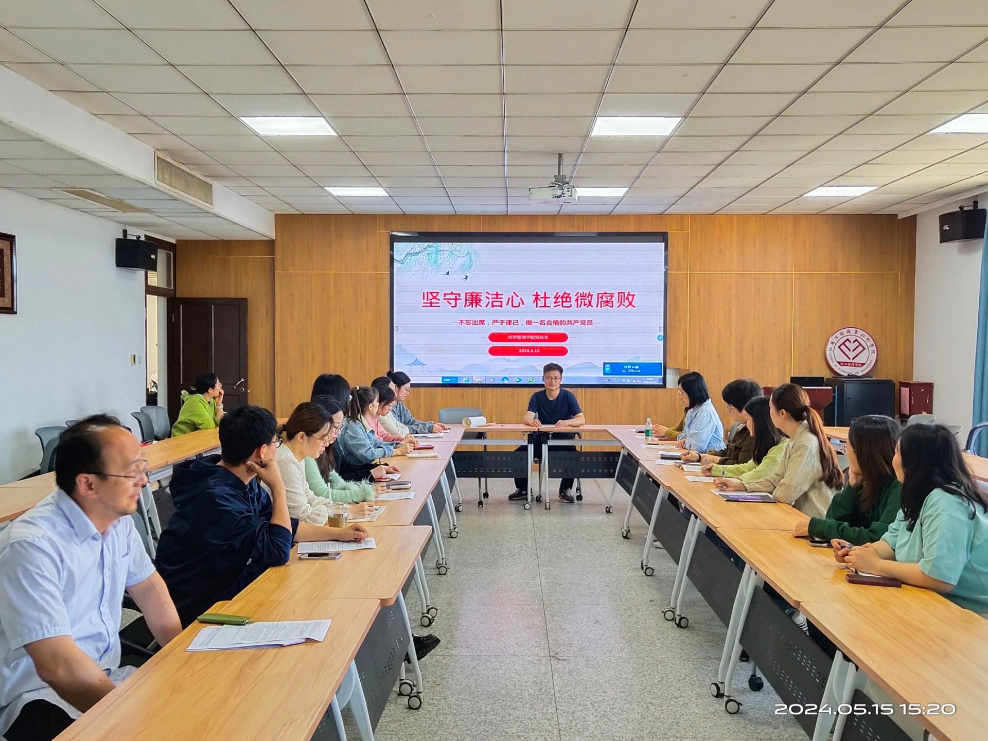 为推进全面从严治党,夯实党风廉政建设,进一步巩固教师党员遵规守纪的思想自觉和行动自觉,5月15日下午,经济管理学院党总支副书记王谦以“坚守廉洁心,杜绝微腐败”为题,在致知楼604对学院教师党员开展“5.10”思廉日暨党纪学习教育。