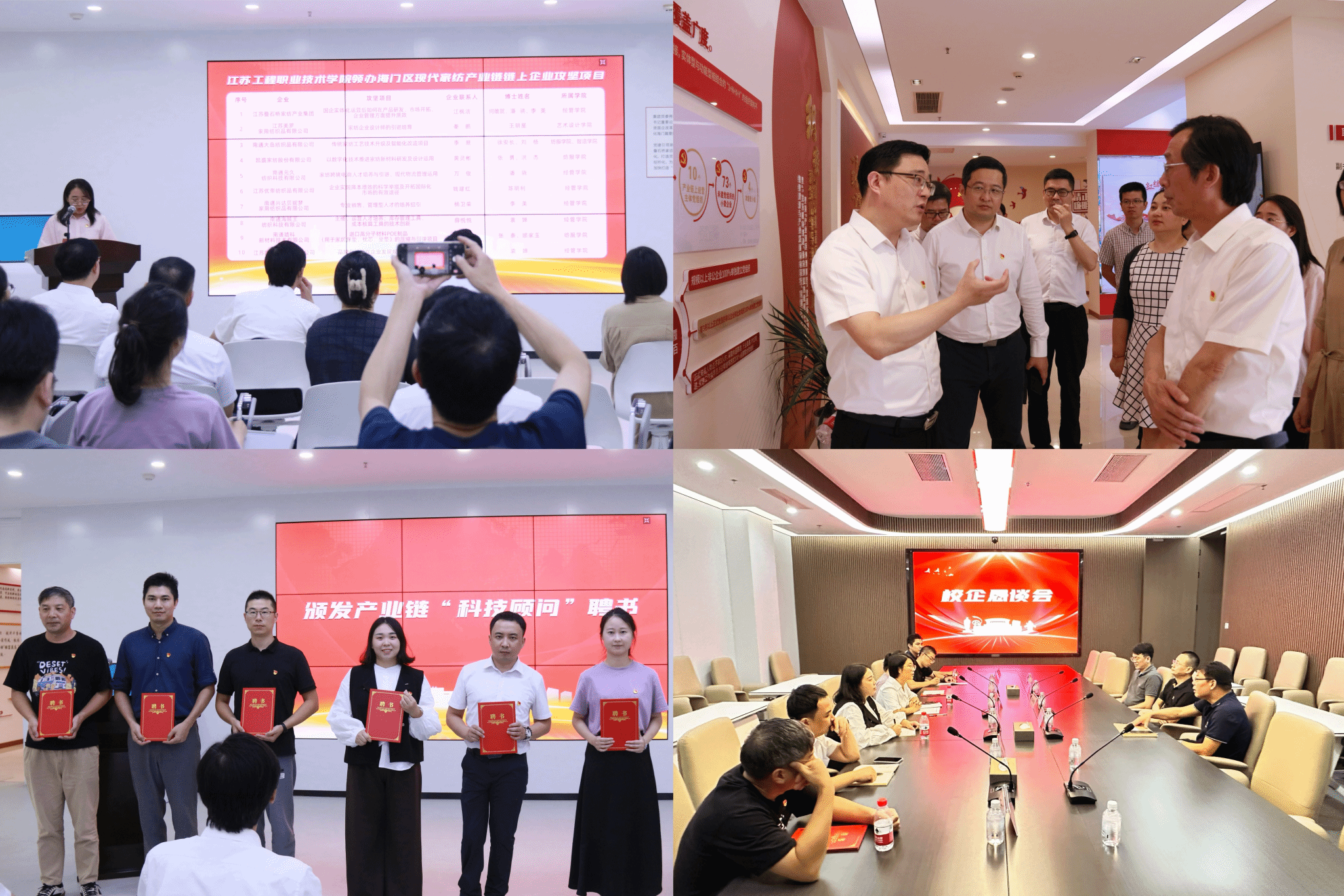 秦志林与三星镇党委书记、海门区现代家纺产业链联合党委副书记殷亮分别代表学校党委和海门区现代家纺产业链党委签署《党建共建协议》。仲岑然与海门区委组织部部务委员赵勇共同签署《校地共建党员教育基地框架协议》。活动中,范晔与海门区委社工部部长、两新工委书记朱红兵为“驻企博士工作站”揭牌,校组织部副部长、统战部副部长宁尚洁宣读了“双十行动”项目。